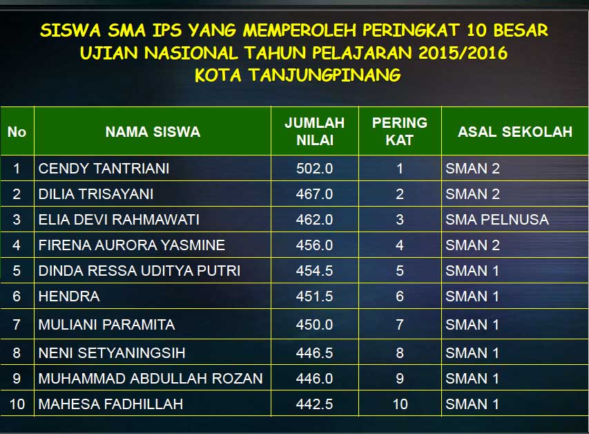 Berikut adalah Rekapitulasi Hasil Ujian Nasional SMA di Kota Tanjungpinang Tahun Pelajaran 2015/2016.