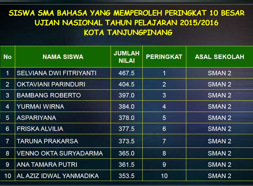 Berikut adalah peringkat SMAN 2 Tanjungpinang di Propinsi Kepri tahun 2015/2016